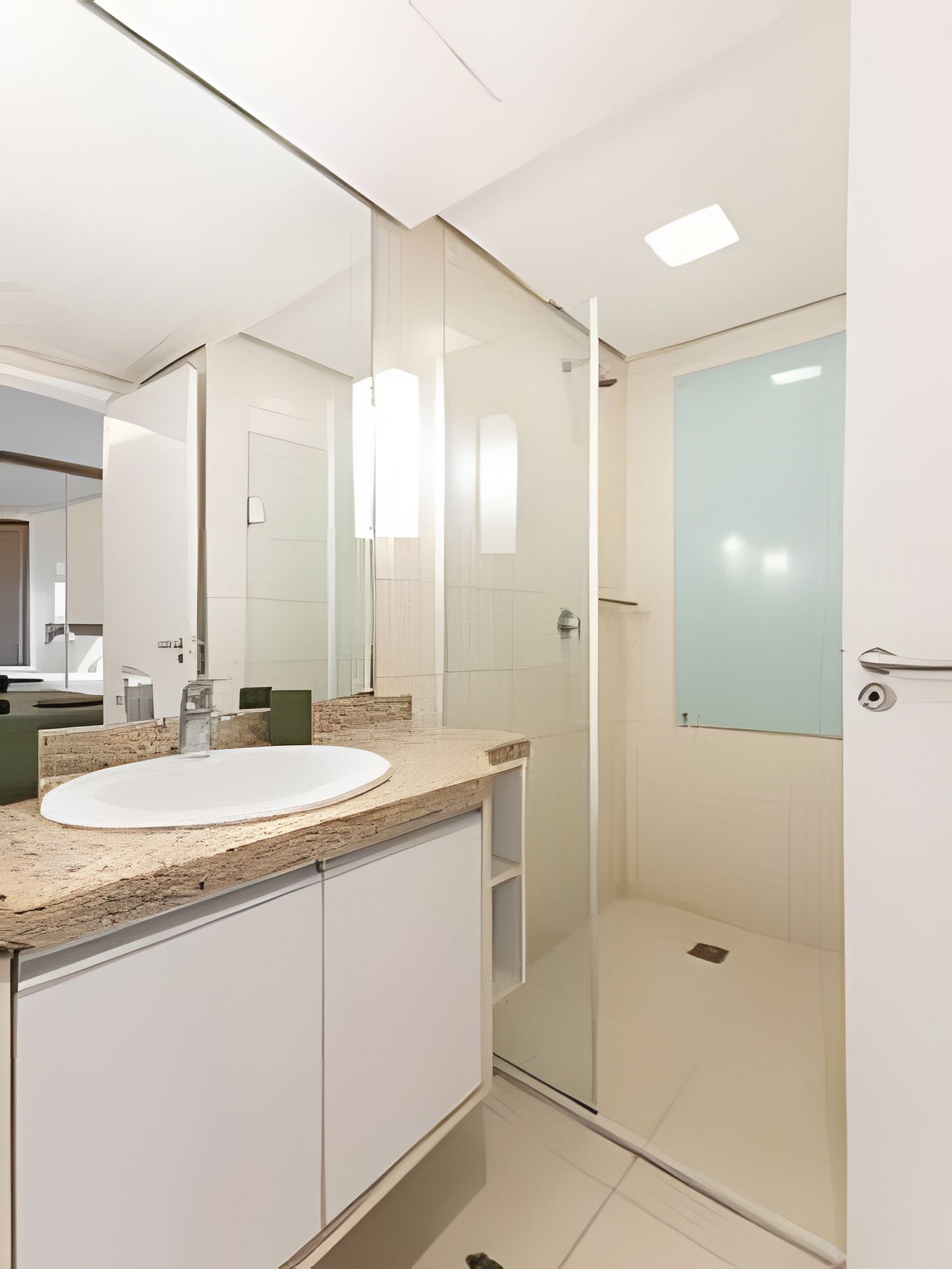 Quarto suíte conta c/ cama king, 02 guarda-roupas embutidos e espaçosos e ar condicionado sprint c/ acesso também à varanda. Banheiro da suíte com ducha com aquecimento central, barras de apoio no box e ducha higiênica.